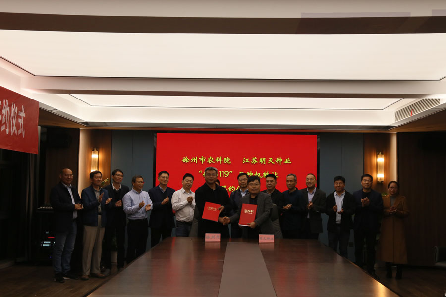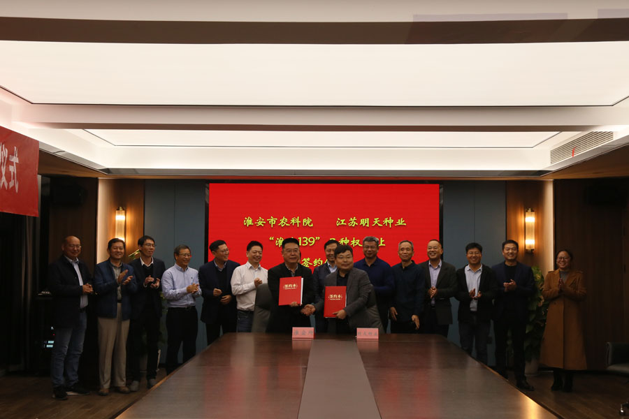 11月25日下午,江蘇明天種業(yè)與淮安市農(nóng)科院、徐州市農(nóng)科院、江蘇(武進(jìn))水稻研究所在公司會議室,就“淮麥139”、“徐稻119”、“武運粳9242”隆重舉行轉(zhuǎn)讓簽約儀式。江蘇明天種業(yè)成功簽約以上三個品種全國獨占實施許可經(jīng)營權(quán)。江蘇省農(nóng)業(yè)農(nóng)村廳、江蘇省農(nóng)業(yè)科學(xué)院、淮安市農(nóng)業(yè)科學(xué)院、徐州市農(nóng)業(yè)科學(xué)院、江蘇(武進(jìn))水稻研究所等領(lǐng)導(dǎo)、專家到會見證。會議由江蘇明天種業(yè)科技股份有限公司嚴(yán)輝民總經(jīng)理主持。 簽約儀式上,育種團(tuán)隊代表淮安市農(nóng)科院楊子博主任、徐州市農(nóng)科院胡婷婷主任、武進(jìn)所朱邦輝副所長分別就三個品種的育種思路及品種特性做了詳細(xì)的介紹;明天種業(yè)經(jīng)營團(tuán)隊介紹了目前三個品種的試驗示范情況以及品種的精準(zhǔn)定位和推廣思路,并表示與育種團(tuán)隊共同做大做強(qiáng)三個品種的決心。 淮安市農(nóng)科院彭杰書記、徐州市農(nóng)科院楊峰副院長、武進(jìn)所徐玉峰所長分別對明天種業(yè)團(tuán)隊給予高度贊揚(yáng),表示品種能簽約明天種業(yè)很是放心,此前明天種業(yè)與三家單位已有深厚的合作基礎(chǔ),成功建立了良好的合作模式,相信此次合作在目前種業(yè)大環(huán)境下將產(chǎn)生里程碑的意義。 與會的江蘇省農(nóng)科院劉賢金副院長、江蘇省農(nóng)業(yè)農(nóng)村廳種業(yè)管理處馬愛京處長、種子管理站何金龍站長、南繁南鑒站許明站長分別對三個品種的合作表示祝賀,也表示根據(jù)中央一號文件中提出的全面實施種業(yè)振興、加快打造種業(yè)振興骨干力量的要求,明天種業(yè)作為農(nóng)業(yè)農(nóng)村部遴選的國家種業(yè)陣型企業(yè)應(yīng)有所擔(dān)當(dāng),將以此次科企合作作為新的起點,創(chuàng)新思路,大膽開拓,引領(lǐng)江蘇種業(yè)邁入更高的臺階。 江蘇省農(nóng)業(yè)農(nóng)村廳俞衛(wèi)東二級巡視員對此次合作雙方表示祝賀,對科企合作的模式給予充分肯定,并指出江蘇省農(nóng)業(yè)農(nóng)村廳種業(yè)處、種子管理站及南繁南鑒站作為種子服務(wù)部門,應(yīng)加強(qiáng)服務(wù)意識,聯(lián)合更多省內(nèi)科研和企業(yè)力量,將此合作模式在省內(nèi)大力推廣,同時勉勵明天種業(yè)要與育種單位,要共同對這些好品種研究配套的高產(chǎn)優(yōu)質(zhì)栽培方法;要結(jié)合推廣部門建好高產(chǎn)示范方,盡快加大推廣力度。推動江蘇稻麥產(chǎn)業(yè)的發(fā)展,共同為保障江蘇及國家糧食安全、農(nóng)民增收作出貢獻(xiàn)。 淮安市農(nóng)業(yè)科學(xué)院顧正中研究員、江蘇(武進(jìn))水稻研究所徐曉杰書記、江蘇明天種業(yè)科技股份有限公司副總經(jīng)理王波、徐江、師洪飛、總經(jīng)理助理韓國標(biāo)等相關(guān)領(lǐng)導(dǎo)、專家參加此次會議。